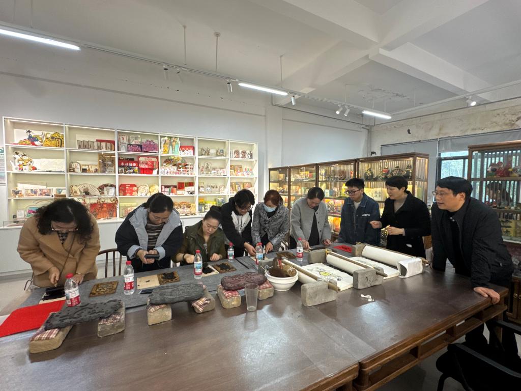 随后,活动进入实践体验环节。在傅老师的悉心指导下,老师们纷纷动手,亲身体验木版年画的拓印技艺。从颜料调制、纸张铺覆到均匀施力拓印,每一个步骤大家都认真操作,沉浸于传统工艺制作的乐趣之中。现场气氛热烈,一幅幅墨色饱满、线条刚劲的年画作品在老师们手中逐渐呈现,古朴的韵味跃然纸上,不仅让大家在实践中领略了非遗技艺的精妙,更在协作交流中深化了两个学院教师之间的情谊。